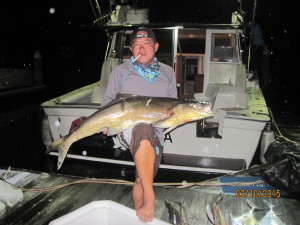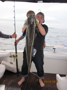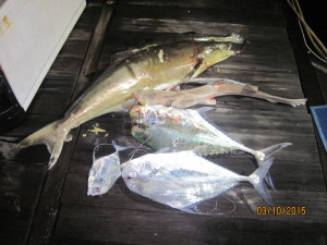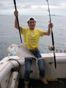 We went out for a King Mackerel with 4 Japan anglers. Fished all day long at far away spots for Kings. Not even a bite. So on the way back home we drop down squid baits on our regular spot. And this is what we got.